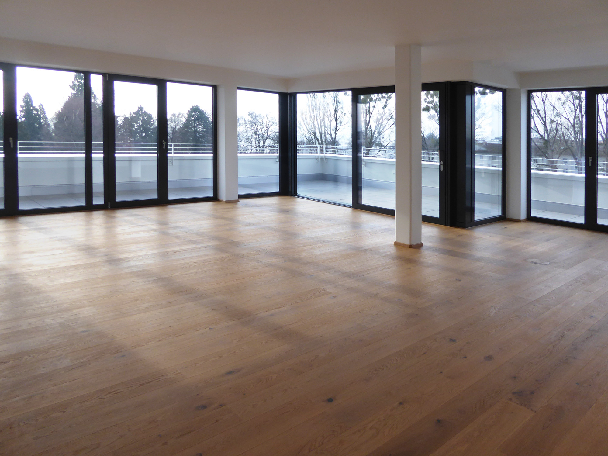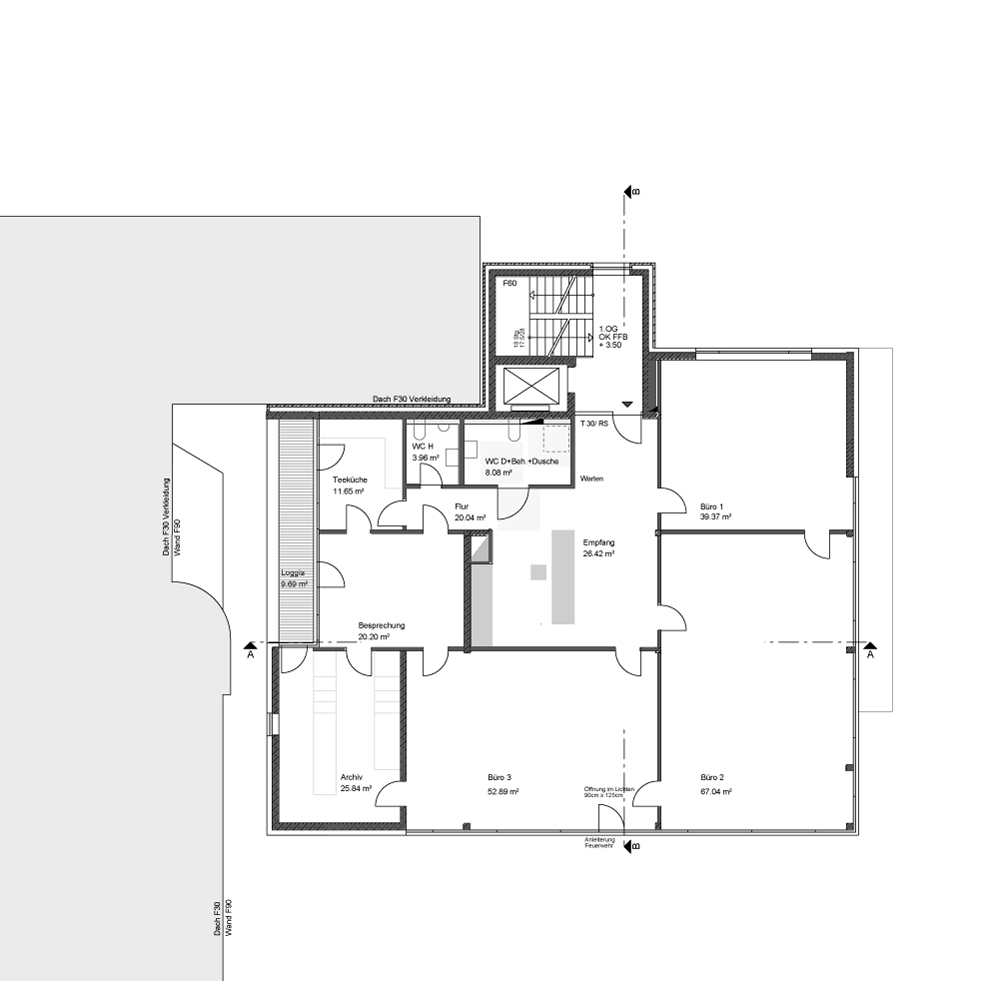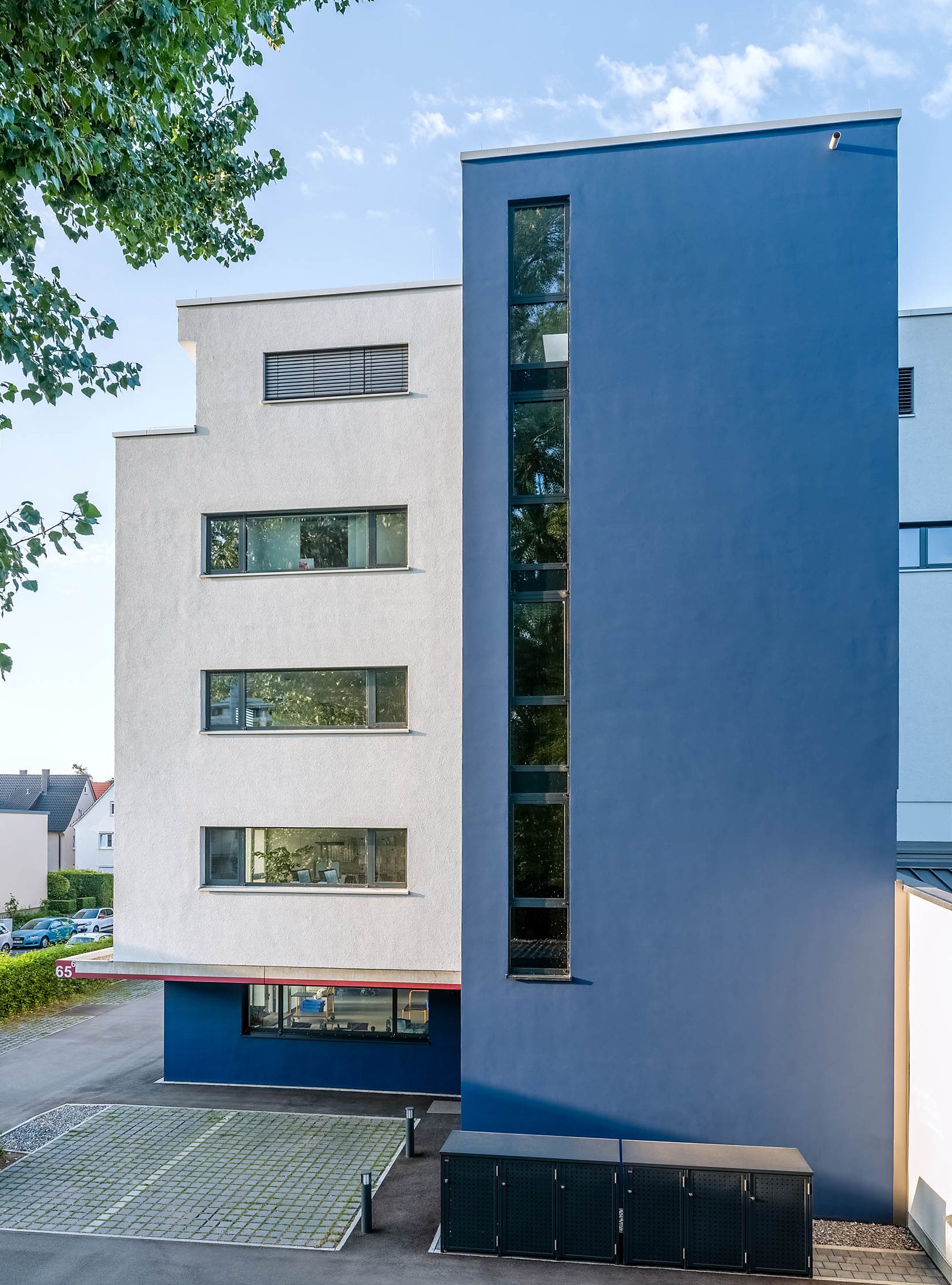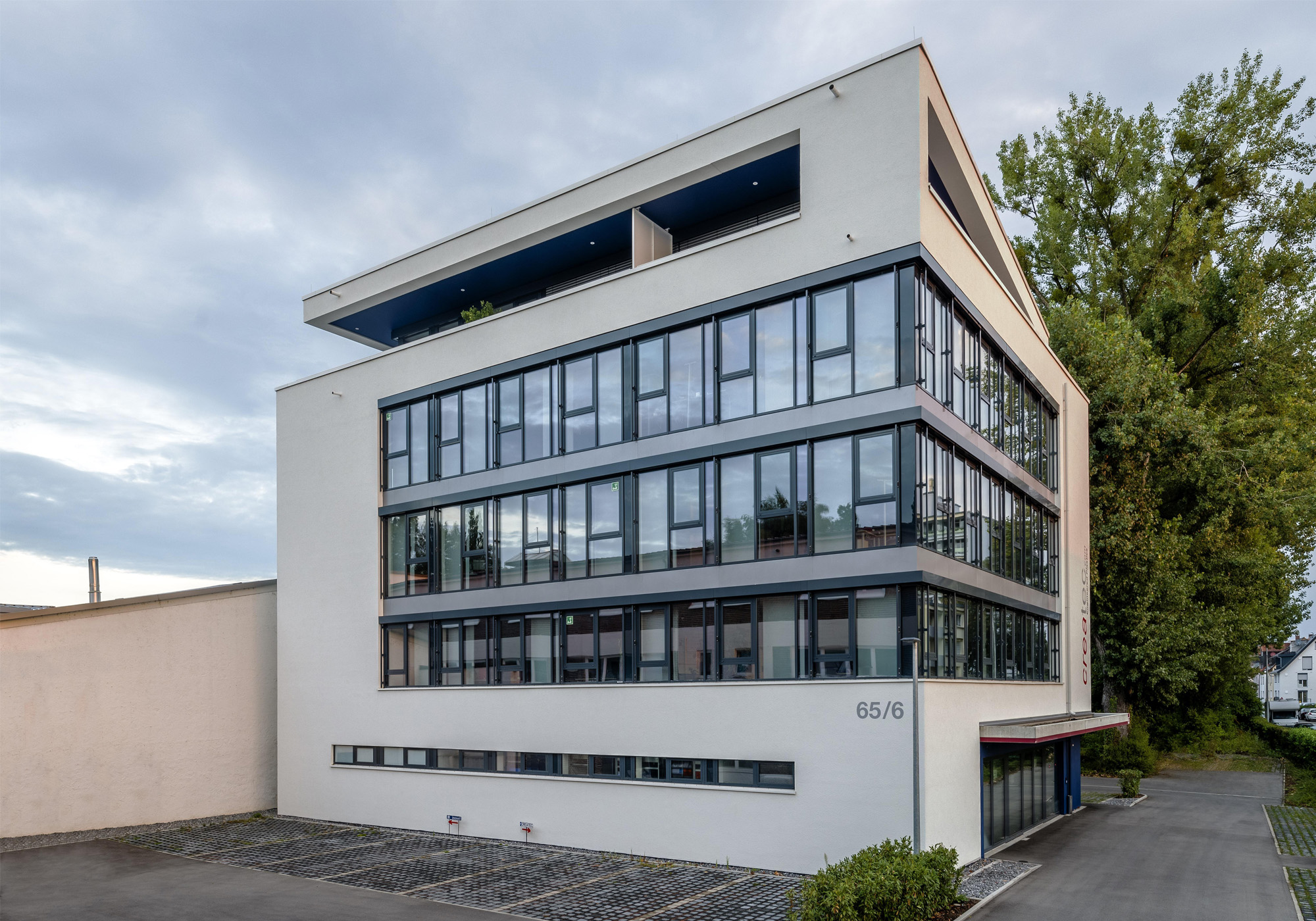 Für einen langjährigen Mieter von Büro- und Lagerflächen im Hüni-Areal wurde eine großzügig Flächenerweiterung notwendig und unumgänglich. Es war der Wunsch am Standort im „Hüni-Park“ bleiben zu können. Da der Immobilienbestand keine Alternativen bot, entschloss sich der Bauherr/Eigentümer zu einem Neubau. Ein alter Lagerschuppen bot nach Abbruch ein eingeschränktes Baufenster für das gewünschte Raumprogramm. Funktionale Anforderungen und Abläufe im Erdgeschoss mit Warenannahme und Warenausgabe und Lager sowie für zwei darüber liegende Bürogeschosse waren klare Vorgaben zur Nutzung und wurden im Entwurfsprozessen umgesetzt: transparente und flexible Büroräume, Empfangsbereich, Besprechungs- und Konferenzräume sowie Personal-, Rekreations- und dienende Räume. Die vertikale Erschließung, Treppe und Aufzug sollten die Anforderung der Flexibilität der vier anderen Geschosse für eine eigenständige Erschließung erfüllen. Der vorläufig geforderte Mieteranspruch wurde so für das erste und zweite Bürogeschoss erfüllt, sollte jedoch optional für einen möglichen Zuschlag erweiterbar sein – was auch im Laufe des Bauablaufes geschah. Großzügige, lichtdurchflutete Büroflächen mit großem Stützenraster sorgen für eine offene, flexible und transparente Bürolandschaft. Unterstützt durch ein Doppelbodensystem in dem die gesamte Elektro- und Dateninstallation intelligent organisiert ist. Über innovative Deckensegel für Heizung - Kühlung - integriertes Beleuchtungssystem und Raumakustik wird diese Forderung nachhaltig erfüllt. Durch eine konsequente Betonkonstruktion mit mineralischer Außendämmung, Isolierverglasung in Alu-Pfosten-Riegel Konstruktion und außenliegendem Sonnenschutzsystem wird eine hochwertige Gebäudehülle nach neuesten Anforderungen geschaffen. Die hohen Anforderungen an den Brandschutz wurden in Absprache mit der Feuerwehr individuell gelöst. Die Wärme- und Kälteerzeugung erfolgt durch zwei reversible Luft/Wasser-Wärmepumpen. Zur Abdeckung von Spitzenlasten und zur Verlängerung der Laufzeit bzw. Stillstandzeit steht ein Pufferspeicher zur Verfügung.
